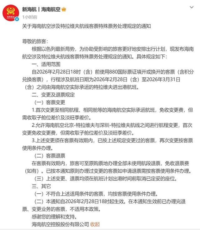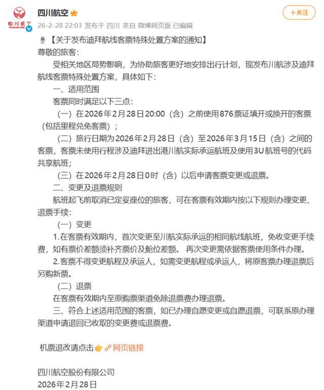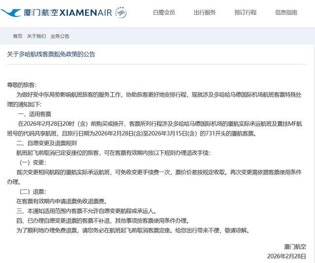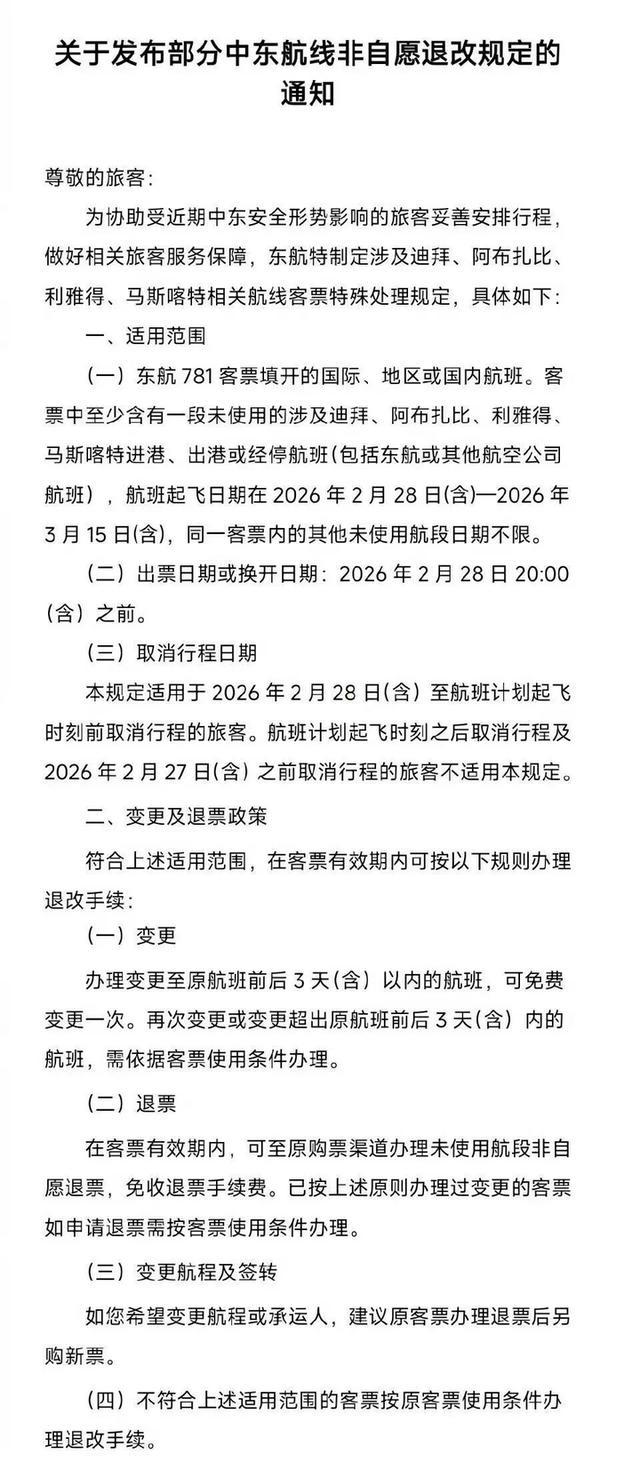 对于客票未使用行程涉及旅行日期为2026年2月28日(含)至2026年3月15日(含)之间,出票日期或换开日期在2026年2月28日20:00(含)之前,并符合条件的相关航线客票,在客票有效期内,可至原购票渠道办理未使用航段非自愿退票,免收退票手续费。旅客可以通过航空公司官方渠道了解详细退改签政策和办理退改签手续。