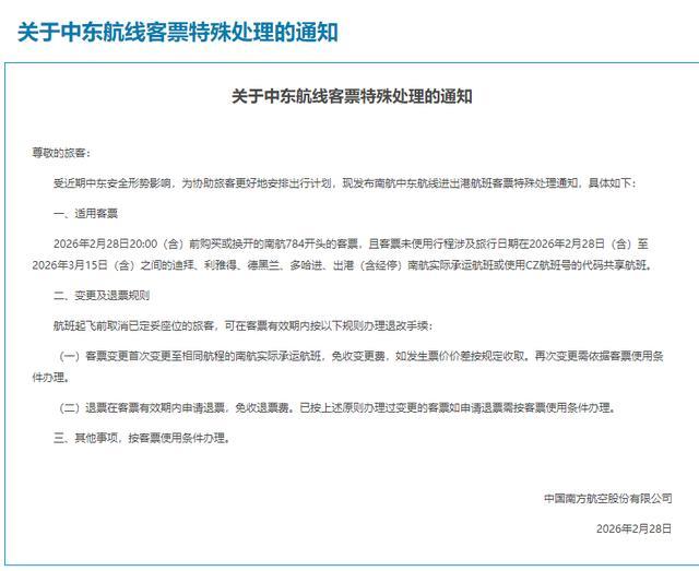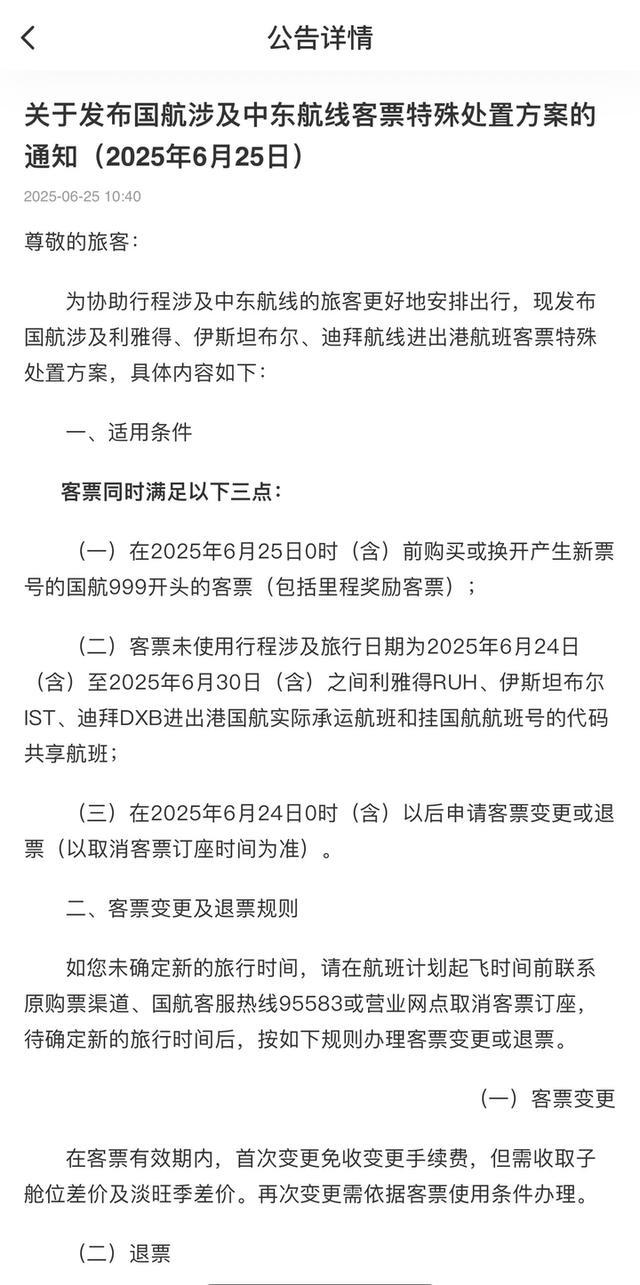 为协助受近期中东安全形势影响的旅客妥善安排行程,做好相关旅客服务保障,国航、东航、南航特制定涉及迪拜、阿布扎比、利雅得等相关航线客票特殊处理规定。
